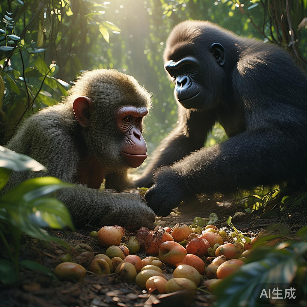 这时候,它的邻居猩猩来了,一脸兴奋地跟猴子说:“嘿,猴哥!现在正是摘桃子的好时机啊,绝对能卖个不错的价格!”